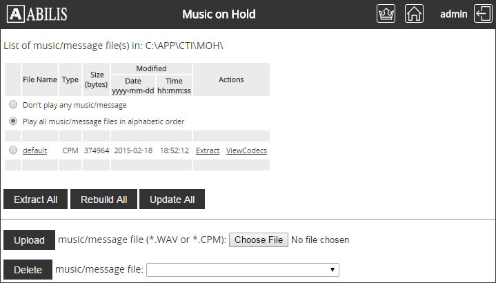 This section allows to modify the music on hold for the telephone calls.
