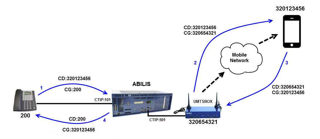 CTIP 101 (for example number 200) makes a call to a cell phone (number 320123456);