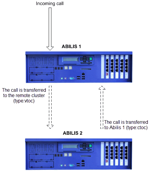 Abilis 1 and Abilis 2 are connected between them with a cluster. A call is received by Abilis 1 and the operator routes the call toward Abilis 2. Then the remote user reroutes the call toward the Operator. Without CPO the calls (one from Abilis 1 to Abilis2 and one from Abilis 2 to Abilis 1) remain active and can cause a degradation of the quality.