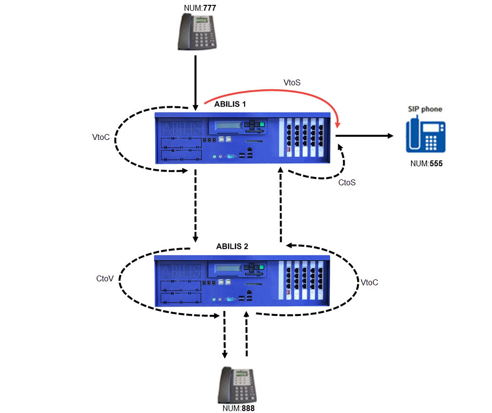 Abilis1 and Abilis2 are connected between them with a cluster. The user (777) of Abilis1 make a call to user (888) of Abilis2. The user forward the call toward the other user (555) of Abilis1. Without CPO the calls (one from Abilis 1 to Abilis2 and one from Abilis 2 to Abilis 1) remain active and can cause a degradation of the quality.