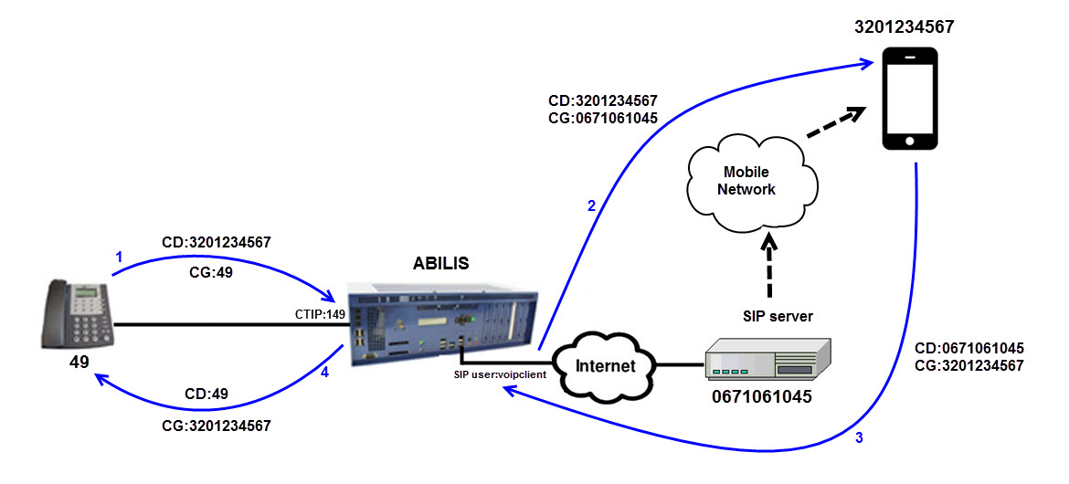 CTIP 149 (for example number 49) makes a call to a phone (number 3201234567);