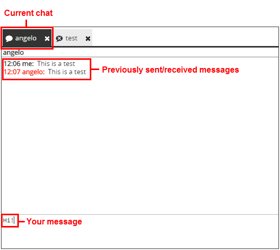 For each open chat there is a corresponding tab. Click on the tabs to switch between two or more chats. A text input box at the bottom of the window allows you to write your message and send it pressing Enter. The received and sent messages are displayed on the screen.
