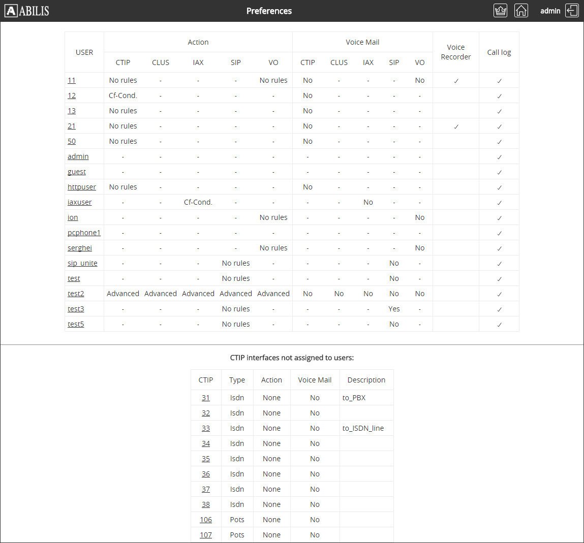 Click Preferences to view a list of the users and CTIP interfaces not assigned to users.