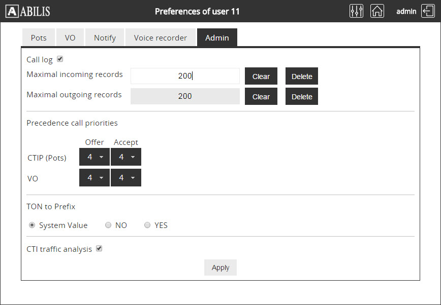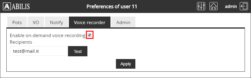 An additional privilege for administrator user, it can activate On-Demand Voice Recording. Click on the Voice recorder tab and check Enable on-demand voice recording as in the example below.