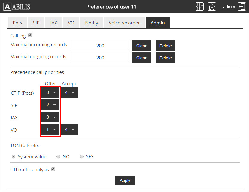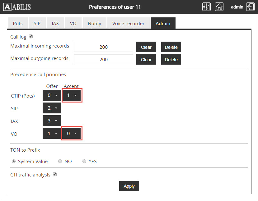 If you don't want to receive precedence calls, set "Accept" value 0.