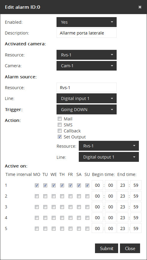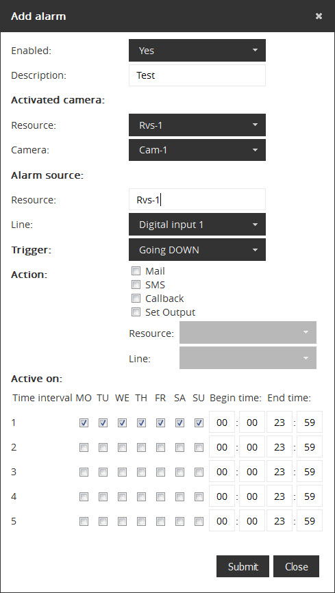 To add a new alarm fill the fields and click on Submit. The alarm has been added
