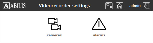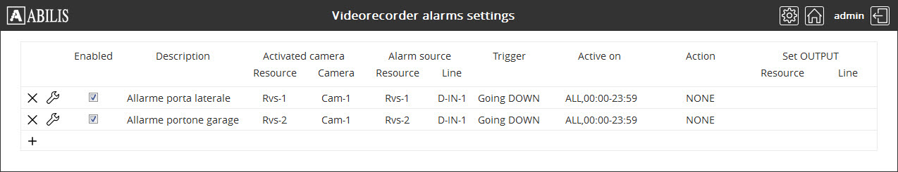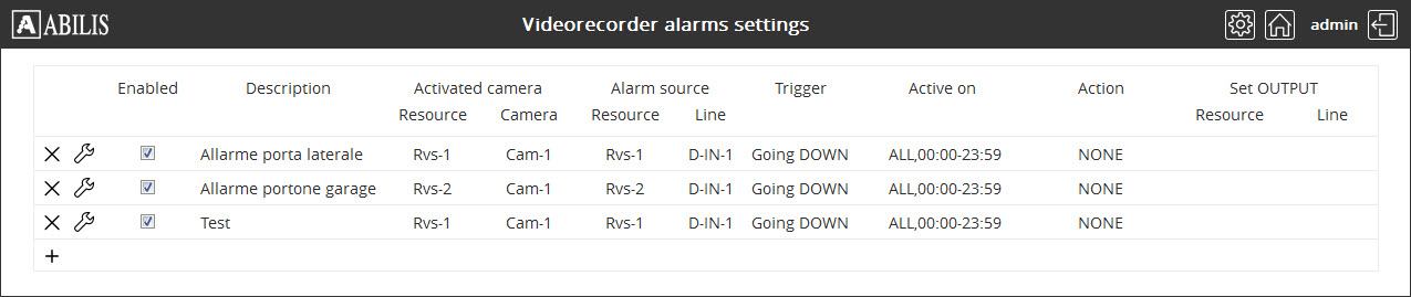 On the Videorecorder settings page click on button to access to the Videorecorder alarms settings. This page displays the list of alarms for cameras and their most important settings.