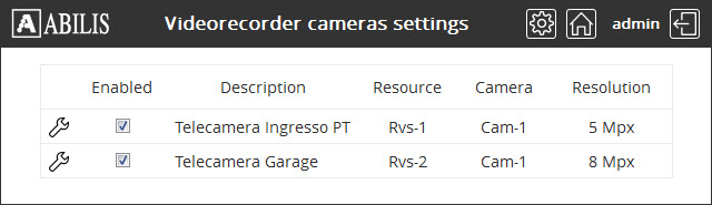 Click on button to access to the Videorecorder cameras settings. This page displays the list of cameras and their most important settings.
