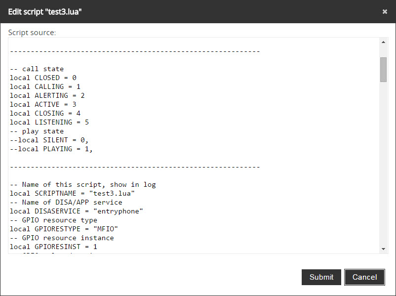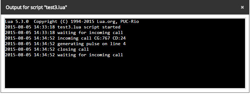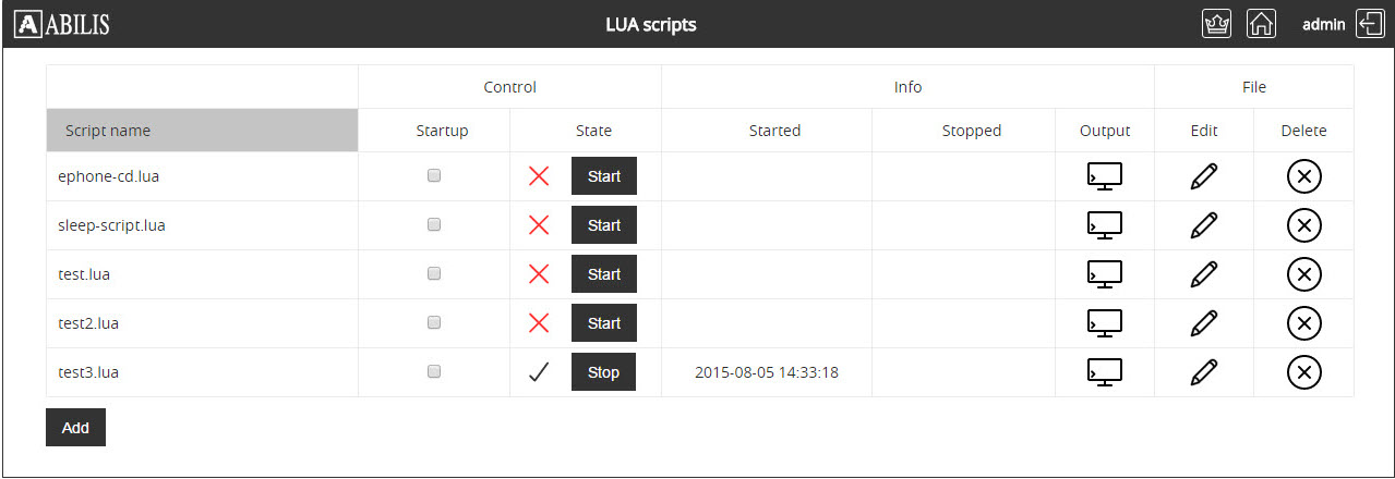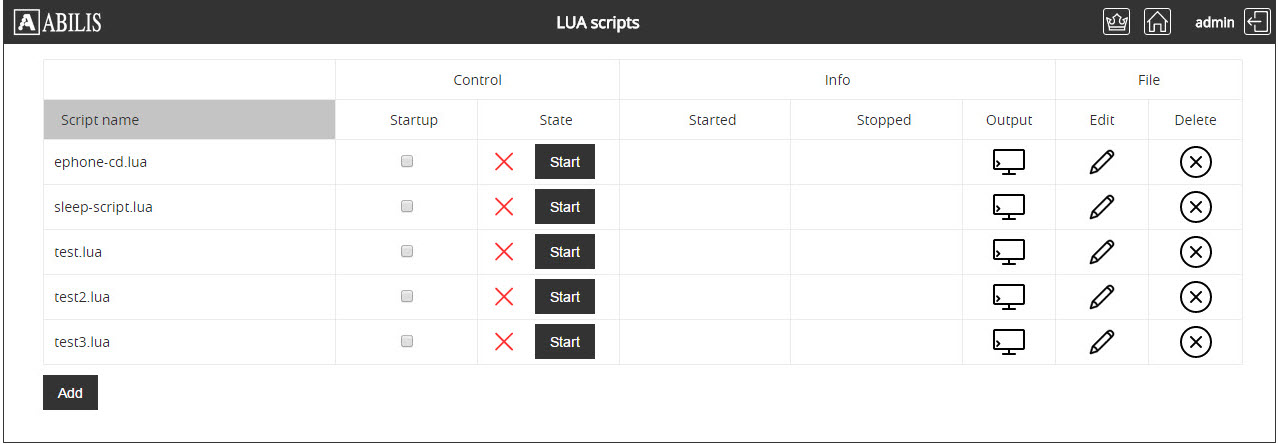 This section allows to add, remove, change, start, stop, add on startup, view script output and rename the LUA scripts.