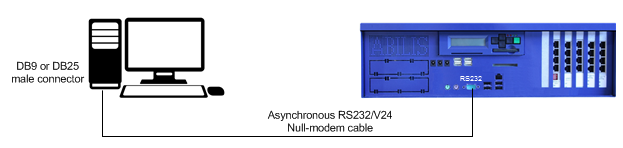 Connect an asynchronous RS232/V24 Null-Modem cable (DB9F-DB9F or DB9F-DB25F) from the Abilis asynchronous port (PAD-1) to the serial DB9 or DB25 male connector of your PC.