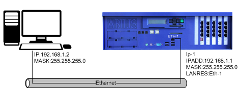 Connect an Ethernet RJ-45 straight cable from the Abilis Eth-1 port to a hub or switch, while making sure that your PC is also connected to the same hub or switch. It's also possible to connect an Ethernet RJ-45 cross cable from the Abilis Eth-1 port to your PC.