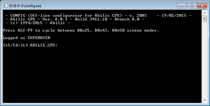 The Console configurator is a utility to create and modify the Abilis CPX configuration files offline. It's a console mode Windows application which precisely reproduce the same Control Port interface available on a working Abilis CPX.