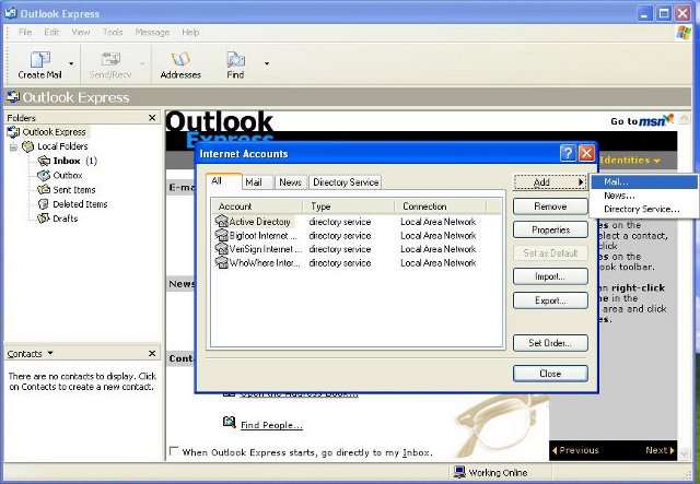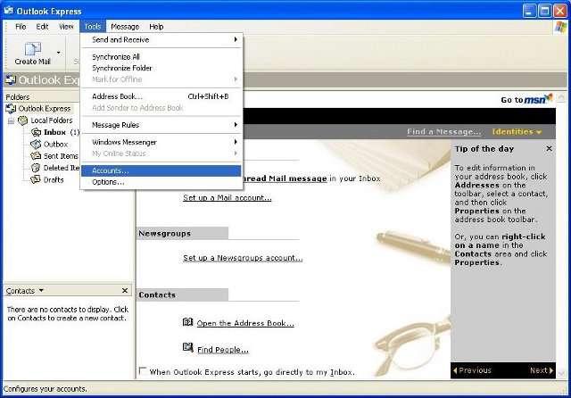 1. Open Outlook Express and click tools/accounts.