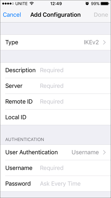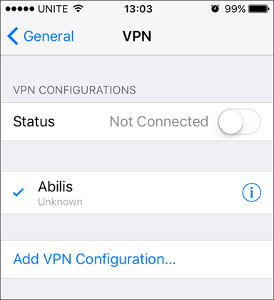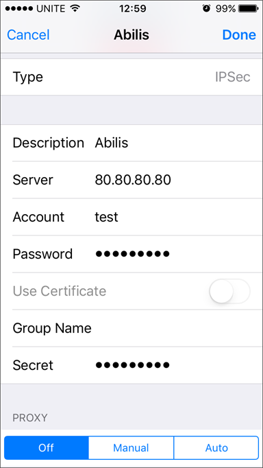 To configure an Apple iOS device for IPsec VPN connection with Abilis: