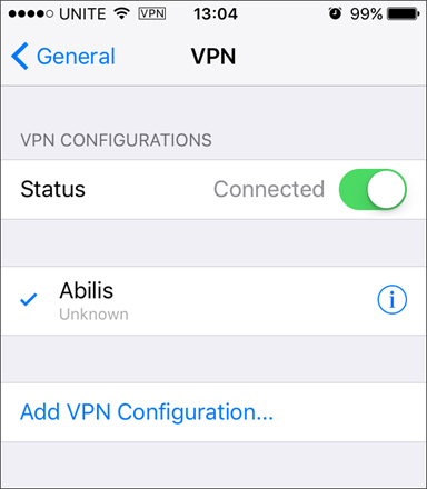 In the future, you can turn the VPN on/off very quickly by simply going to Settings > VPN and toggling the slider button.