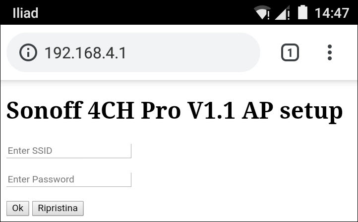 Open the browser and enter the IP 192.168.4.1 in the URL bar. In the page enter the SSID and the password of the WiFi and press the Ok button:
